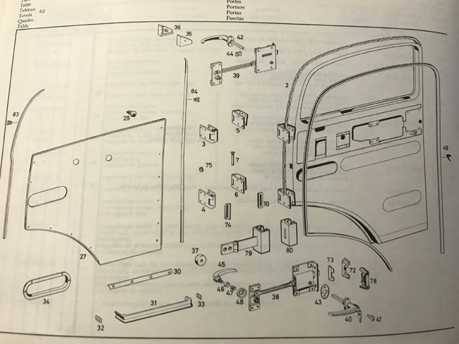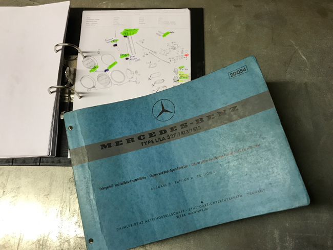 Hér er orginal partabók notuð samhliða útprentun úr rafrænu partakerfi Mercedes-Benz til að skipuleggja innkaup.