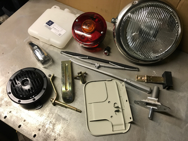 Þegar maður svo finnur til sölu varahluti sem vantar, er gott að tryggja sér án tafar það sem til er, sérstaklega ef að verðið á hlutnum er ásættanlegt. Það er mikilvægt vegna þess að hlutir sem eru til í dag er alls ekki öruggt að séu til á morgun. Ég hef lennt í því sjálfur að ætla að panta eitthvað sem vantar ,,eitthverntíman seinna" og þá er það ekki lengur til og jafnvel fæst ekki lengur. Gott er að velja sem mest upprunalega hluti eða frá upprunalegum framleiðendum, eftir því sem það er hægt ef það á að gera bílinn upp sem upprunalegastann. Þetta á vissulega ekki alltaf við, t.d. ef menn ætla að gera breytingar á bílnum frá upprunalegri smíð hans, en í þessum bíl er verið að stefna á sem upprunalegastan bíl og því er leitað að hlutum sem eru sem mest orginal. Á myndinni hér fyrir ofan má sjá svolítið sýnishorn af hlutum sem búið er að tryggja sér fyrir uppgerðina. Á myndinni má sjá þrjá hluti sem ég náði að fá, en eru þeir síðustu sem voru í boði. Það eru grá lokið, þurrkuarmurinn og þurrkublaðið. Sem dæmi með þessi lok að þá var lokið hægra megin ekki lengur til, en það voru til tvö svona vinstir og því var ákveðið að panta þau bæði og breyta svo öðru lokinu til að það passaði á hægri hliðina. Sú breyting gekk mjög vel og því eru núna til ný lok á báðar hliðar bílsins.