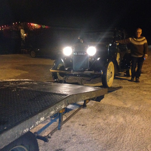 Það þurfti bílaflutningabíl til að flytja hann vegna hálku og snjóa. Hér stendur Bragi við hlið bílsins við afhendingu hans.