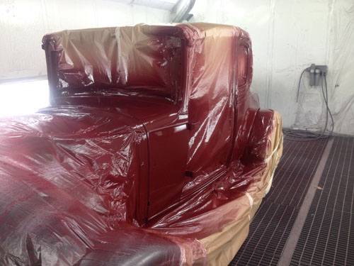 Ég var strax staðráðin í að gefa bílnum ögn líflegri lit en svart og hér er verið að bera við bílinn litaprufu af rauðum lit sem ég var að spá í að setja á bílinn.