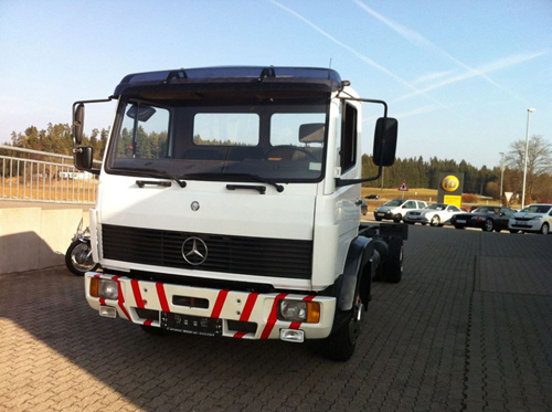Mercedes-Benz 814L árgerð 1989. Þennan bíl flutti ég inn frá Þýskalandi í árslok 2015. Ég leitaði mikið að sniðugum bílaflutningabíl svona gömlum, en gekk illa af finna góðan bíl. Eftir töluverða leit að raunhæfum kosti ákvað ég að kaupa þennan grindarbíl og ætlaði mér bara að byggja sjálfur á hann bílaflutningapall. Þegar hann var rétt kominn til landsins þá mátulega fann ég annan bíl út í Þýskalandi, sem var nokkuð eins og ég vildi hafa hann, tilbúinn með palli og öllu saman. Ég seldi því þennan bíl og keypti hinn bílinn til að flytja hann inn.